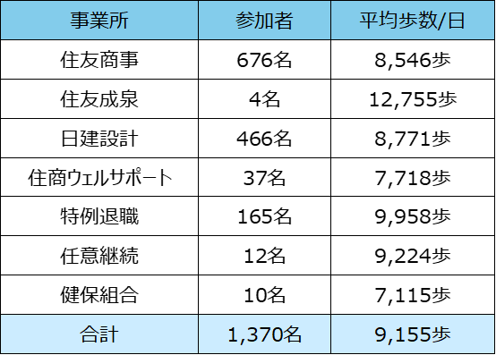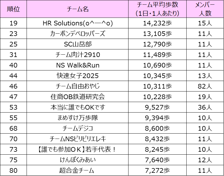 今回の特別賞は、「メンバー10名以上のチームで平均歩数5,000歩以上」を達成した15チームです。