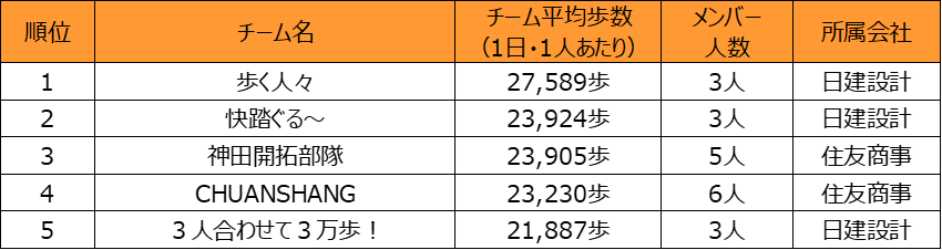 平均歩数が2万歩以上の健康意識の高い「スーパーチーム☆達成賞」受賞の上位5チームはこちら!