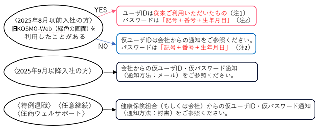 • 注1) リニューアル後のKOSMO WebではユーザIDの英字を全て小文字として扱いますのでご注意ください。