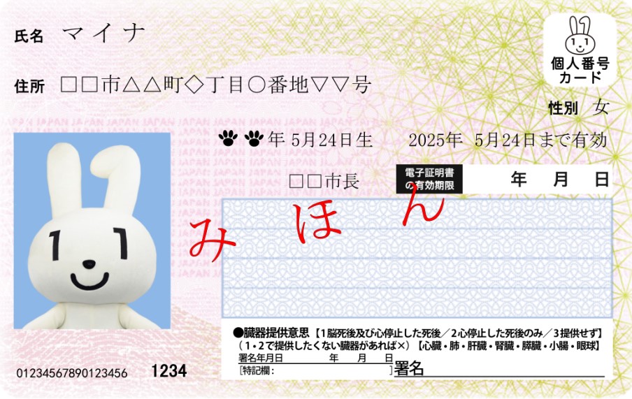 マイナンバーカードは、プラスチック製のICチップ付きカードです。表面に氏名、住所、生年月日、性別、本人の顔写真等、裏面にマイナンバー等が表示されています。