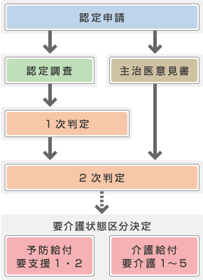 - コンピュータが1次判定を行い、その結果と主治医の意見書をもとに、保健・医療・福祉の専門家で構成される「介護認定審査会」が2次判定を行い、介護の必要度を判定します。