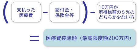 - 前年1月から12月までに支払った医療費が10万円(または年間所得の5%の少ないほう)を超えるとき、上限200万円までがあなたの課税所得額から控除され、税金が確定精算されます。