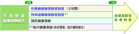 退職したとき ▶退職後の健康保険について 引き続き健康保険に加入したいとき 退職したあとの継続給付 ※1.日本国内に住民票があり、60歳上75歳未満の厚生年金の受給資格を有する退職者が対象になります。 ※2.再就職等される場合